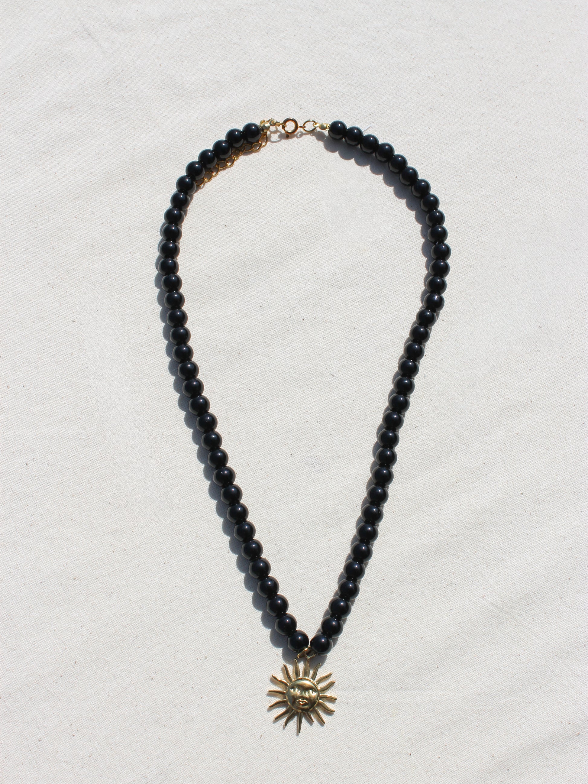 Black natural beads and stainless steel sun charm.