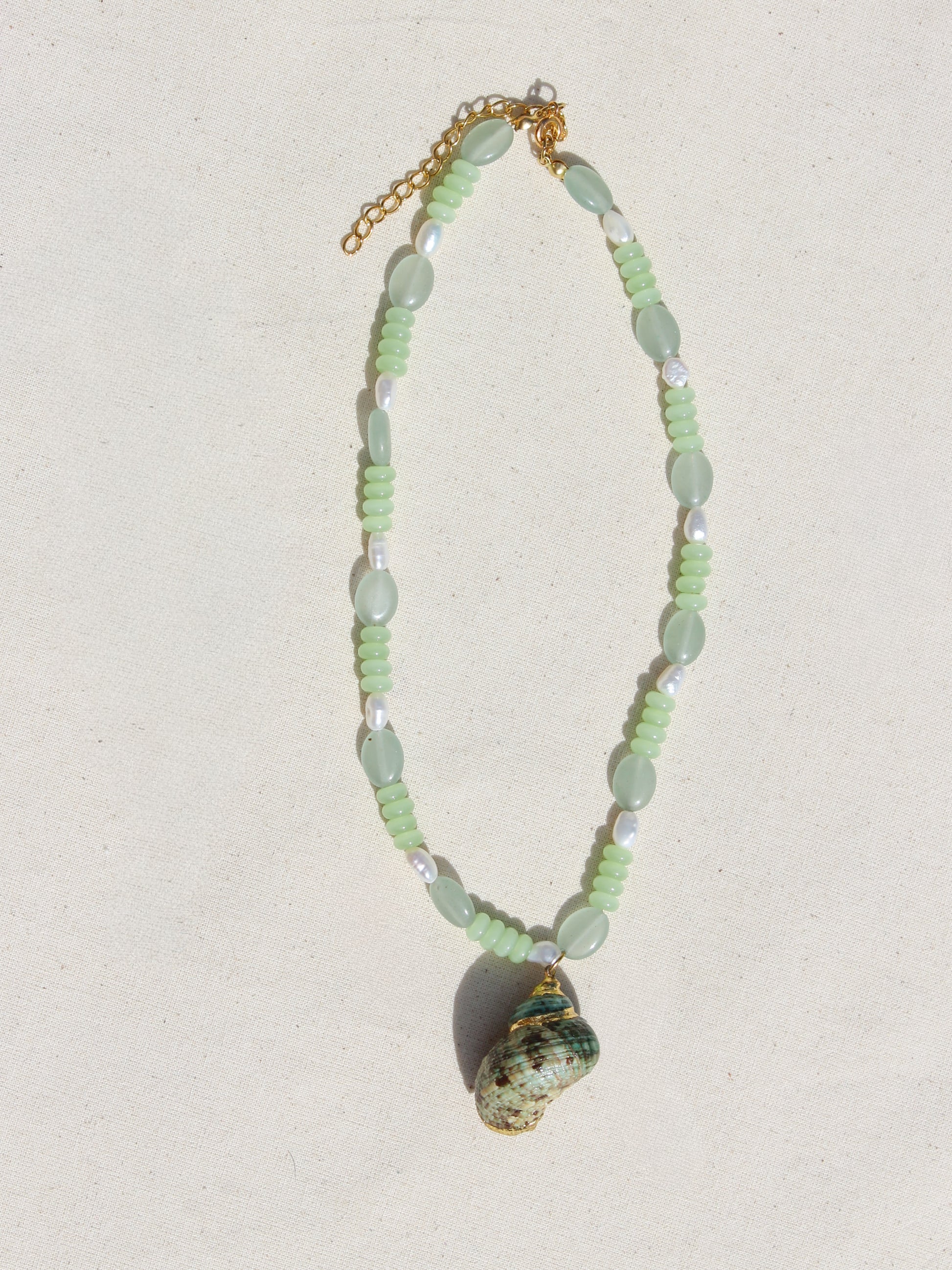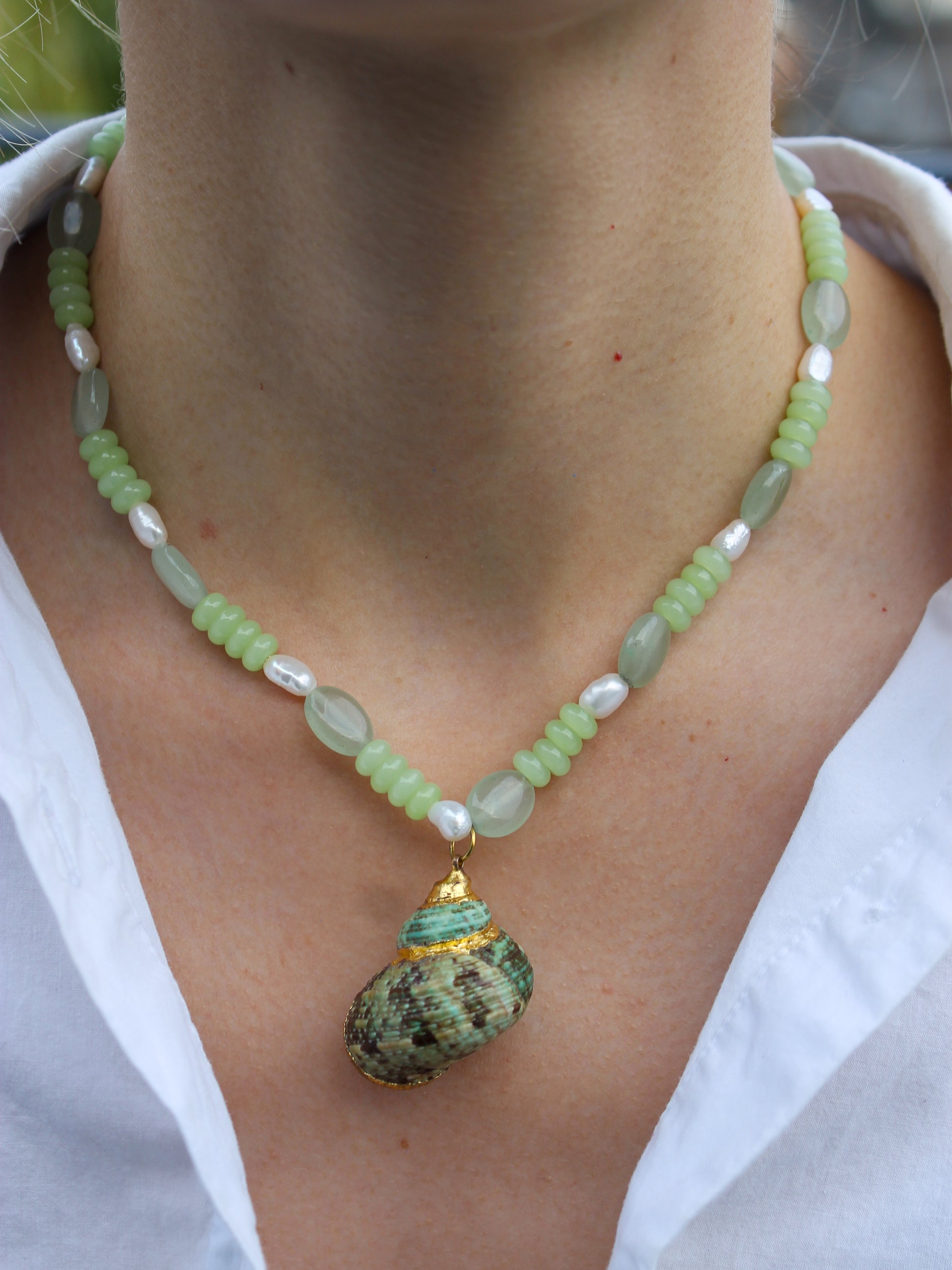 Green natural crystal beads, natural pearls of varying sizes and seashell charm.